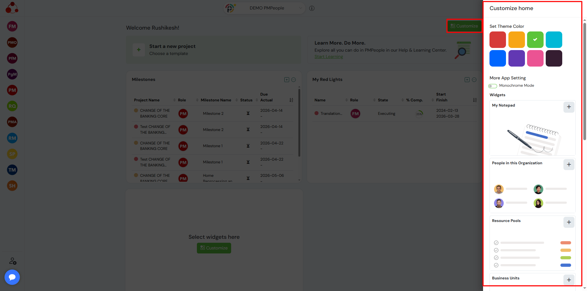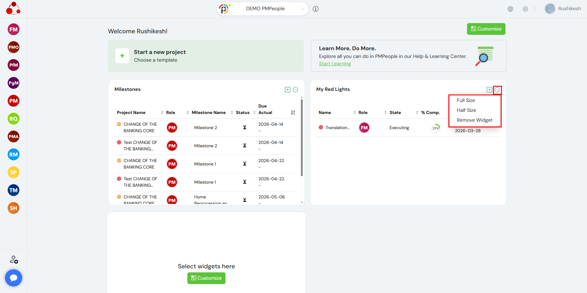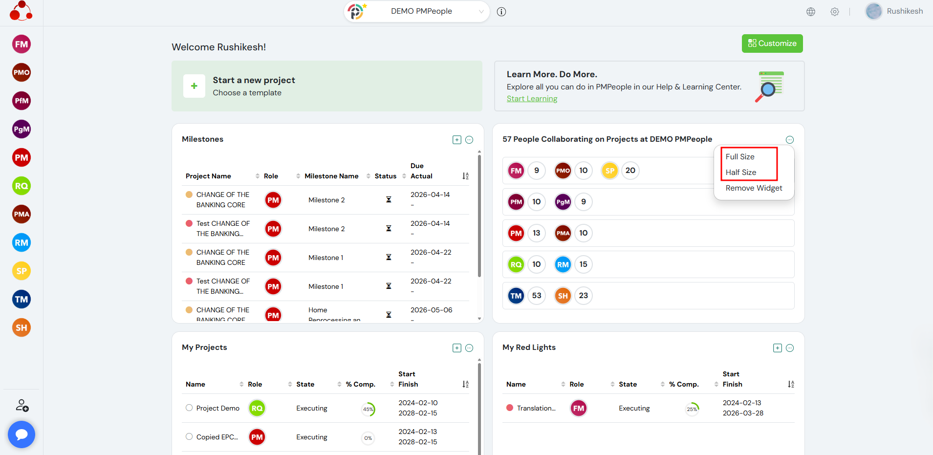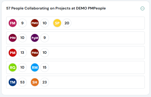 Each widget provides quick visibility into specific data across projects, people, and organization.