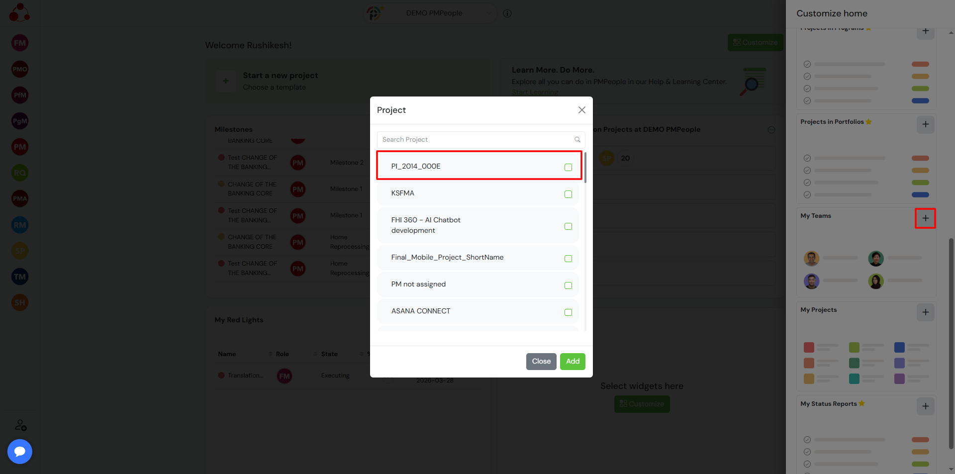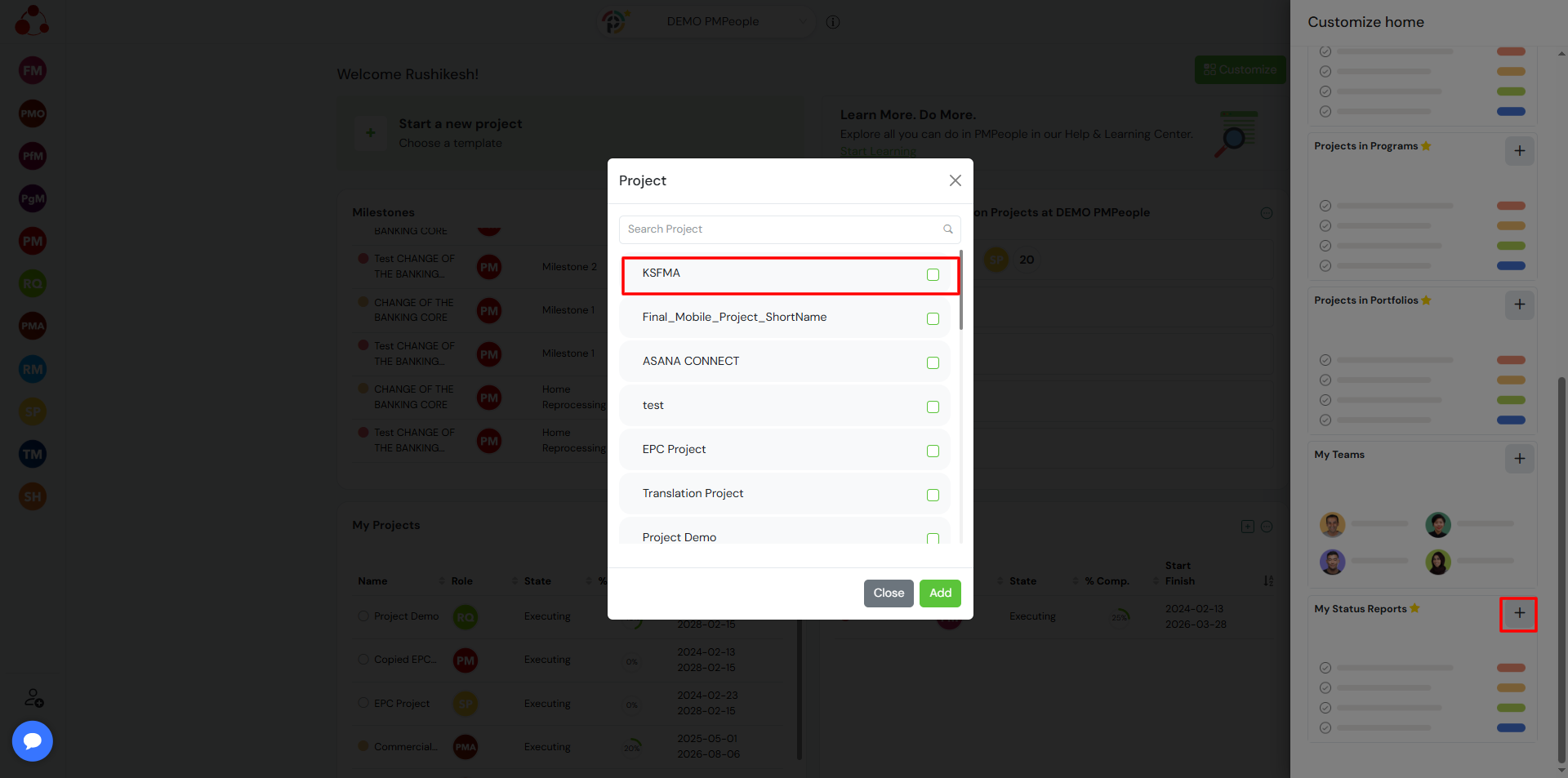 While adding the widget, users must select a specific project for which they want to view the status reports.
