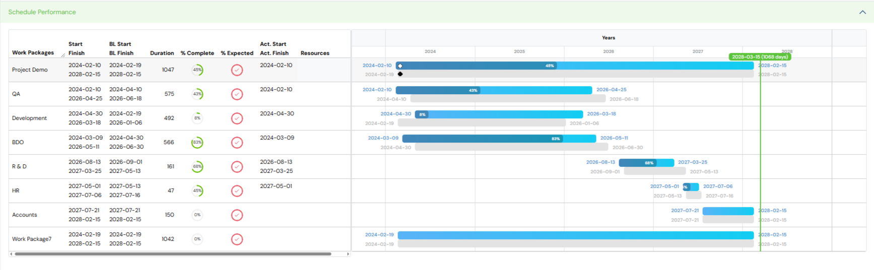 Open section SCHEDULE PERFORMANCE to see a schedule status summary for work package #0.