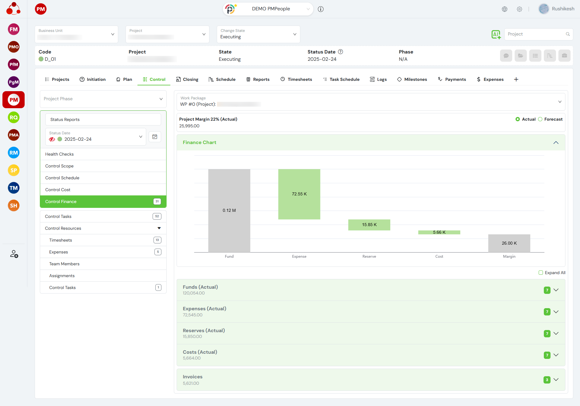 Project managers, or any other management role (PMA, PMO, PfM, PgM), can control project finance at CONTROL > Control Finance, to control actual finance spent up to a review date:
