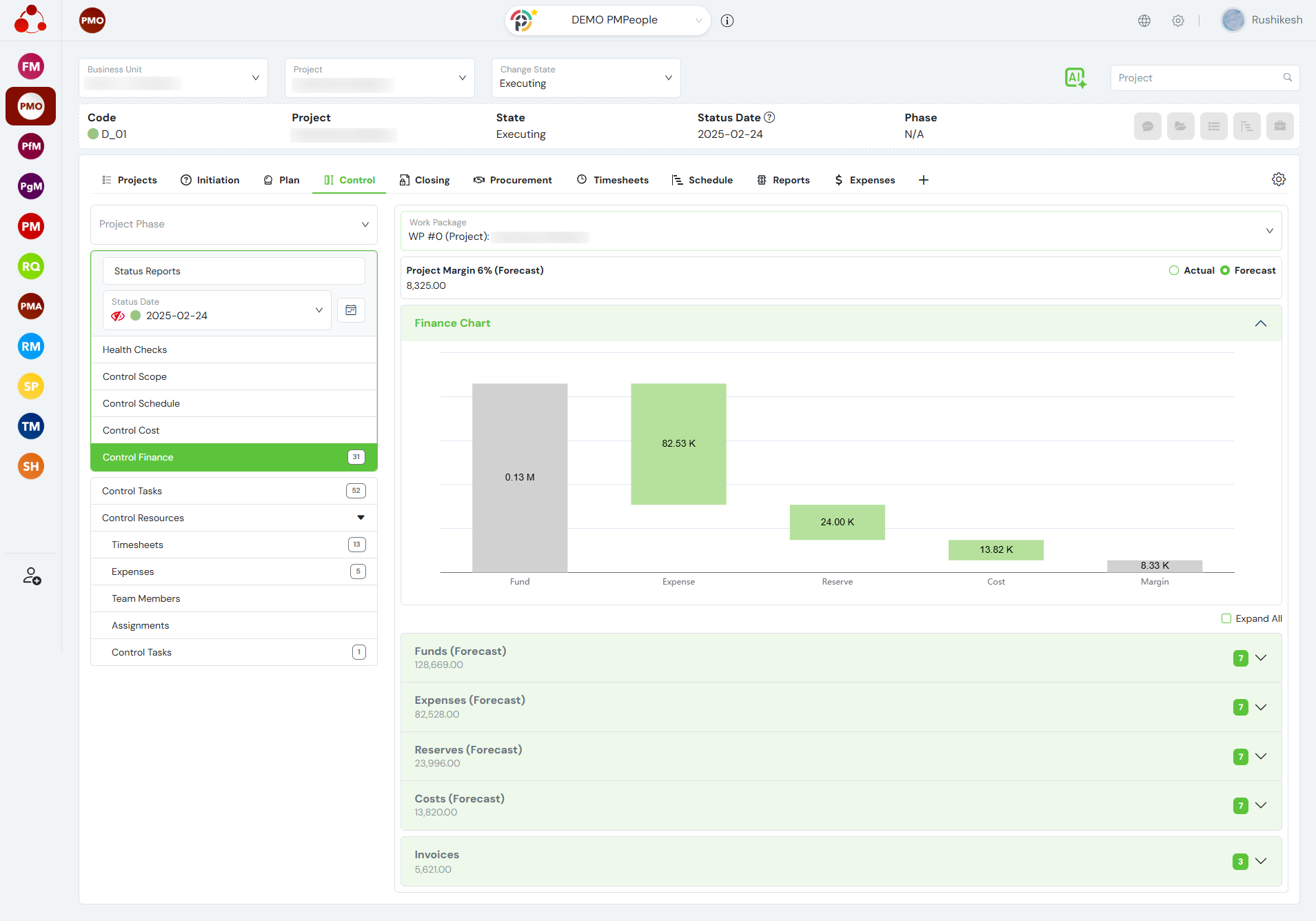 Each status date, users can control actual finance spent so far, and also the finance forecast status at the end of the project: