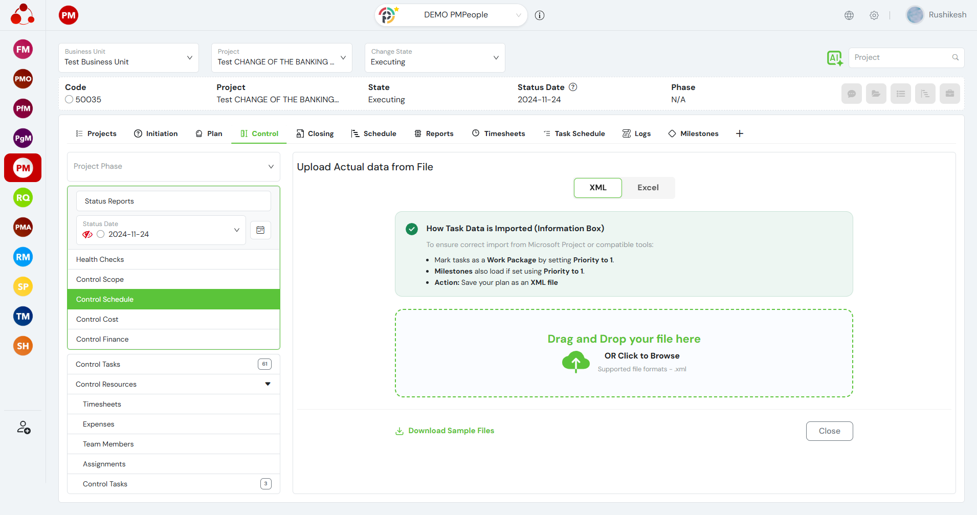 Project managers, or any other management role (PMA, PMO, PfM, PgM), can control project schedule from tasks at CONTROL > Control Schedule > Update from Tasks, using the web application and the mobile application: