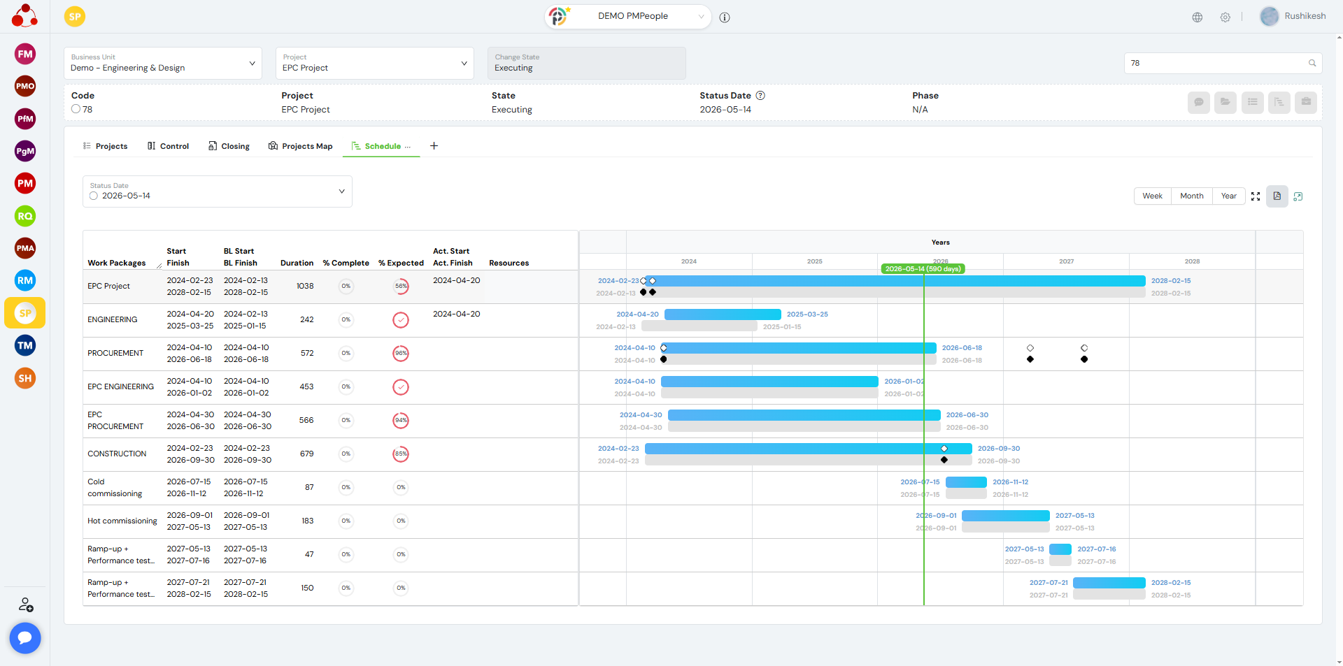 Stakeholders(SH), Requester (RQ), Sponsor (SP), Functional Manager (FM), the Project Manager (PM), or other manager (PM, PMO, PfM, PgM), can monitor schedule at CONTROL > Control Schedule: