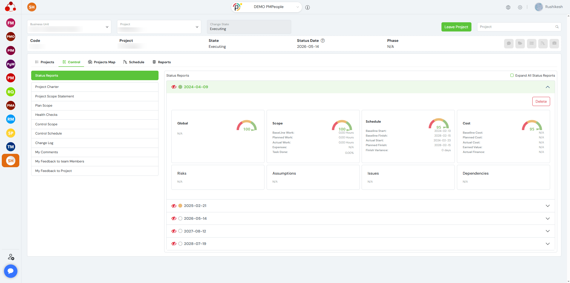 In reliable organizations, stakeholders (SH) can verify or invalidate a project status report at CONTROL > Status Reports: