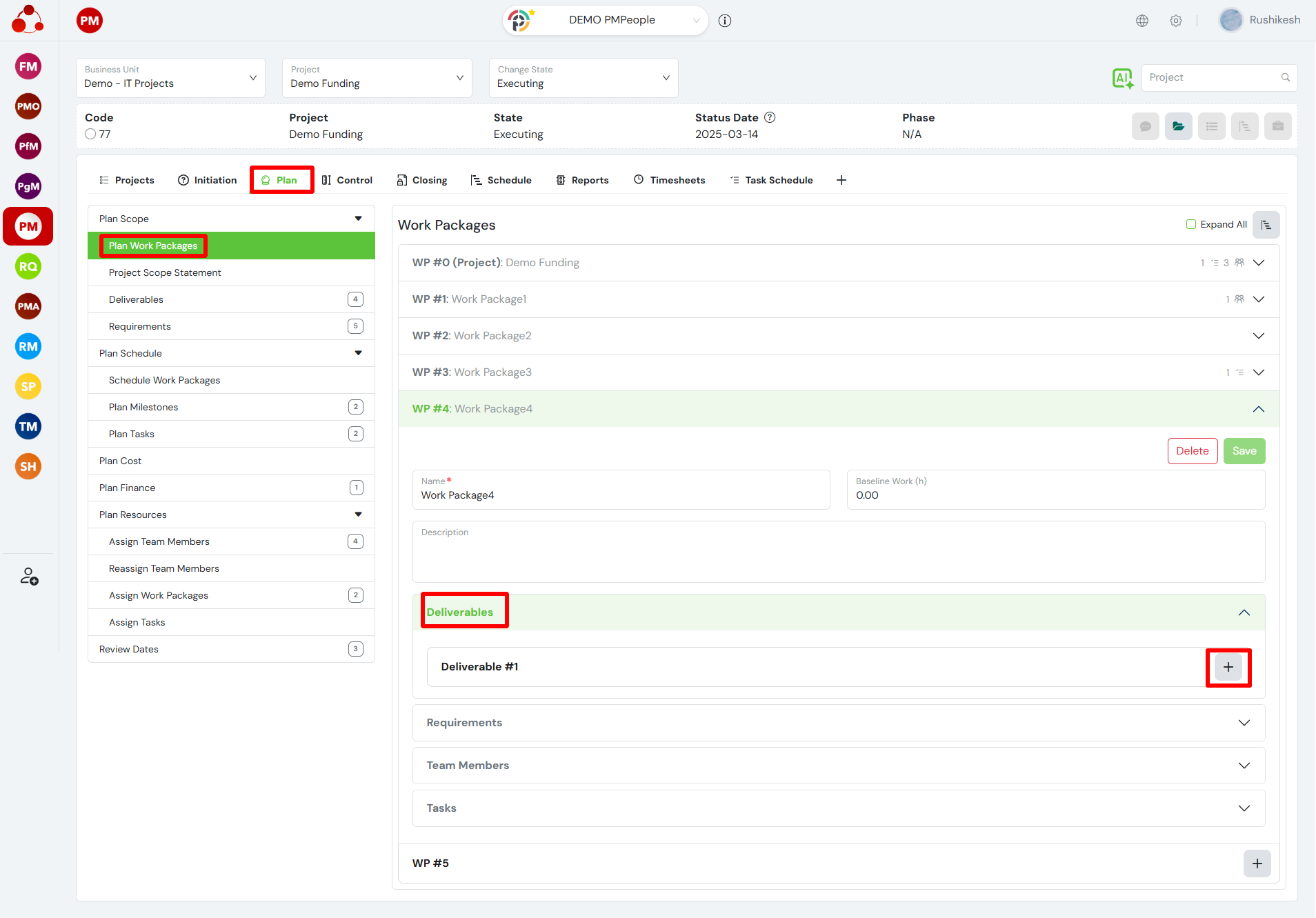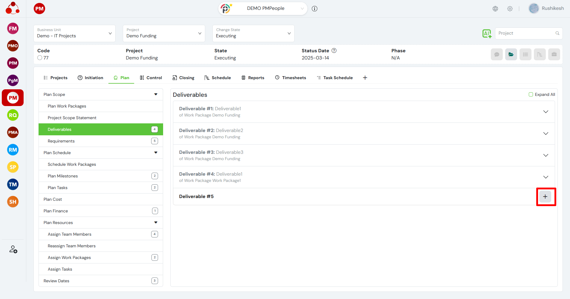 Go to PLAN > Plan Scope > Deliverables or access a specific work package and click the plus icon [+] to add a deliverable. Use the downward arrow to expand it or delete it if needed.