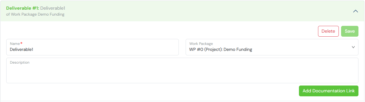 Click the “downward” icon to open an existing deliverable. Deliverables can be deleted with the “Delete” button.