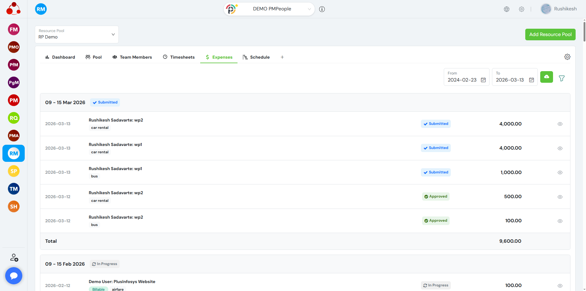 Resource Managers(RM), and also the PMO, can monitor expenses of team members belonging to a resource pool at tab: EXPENSES: