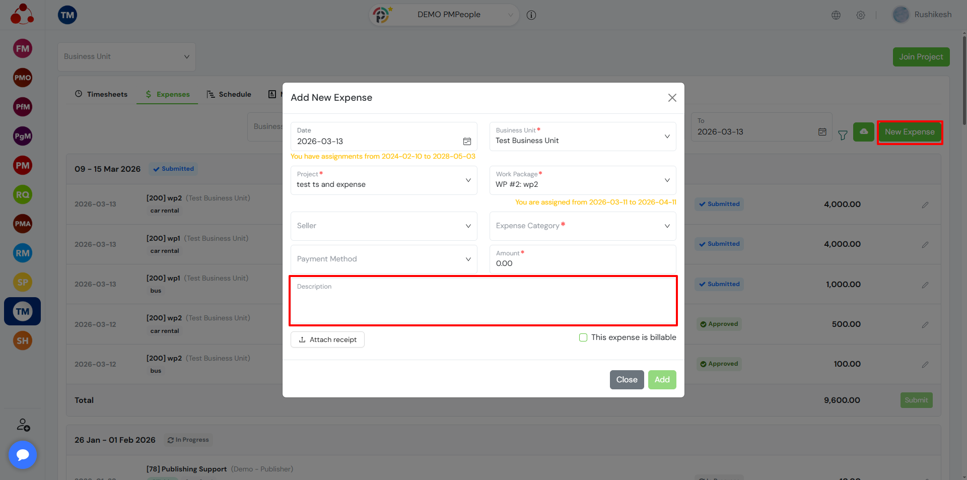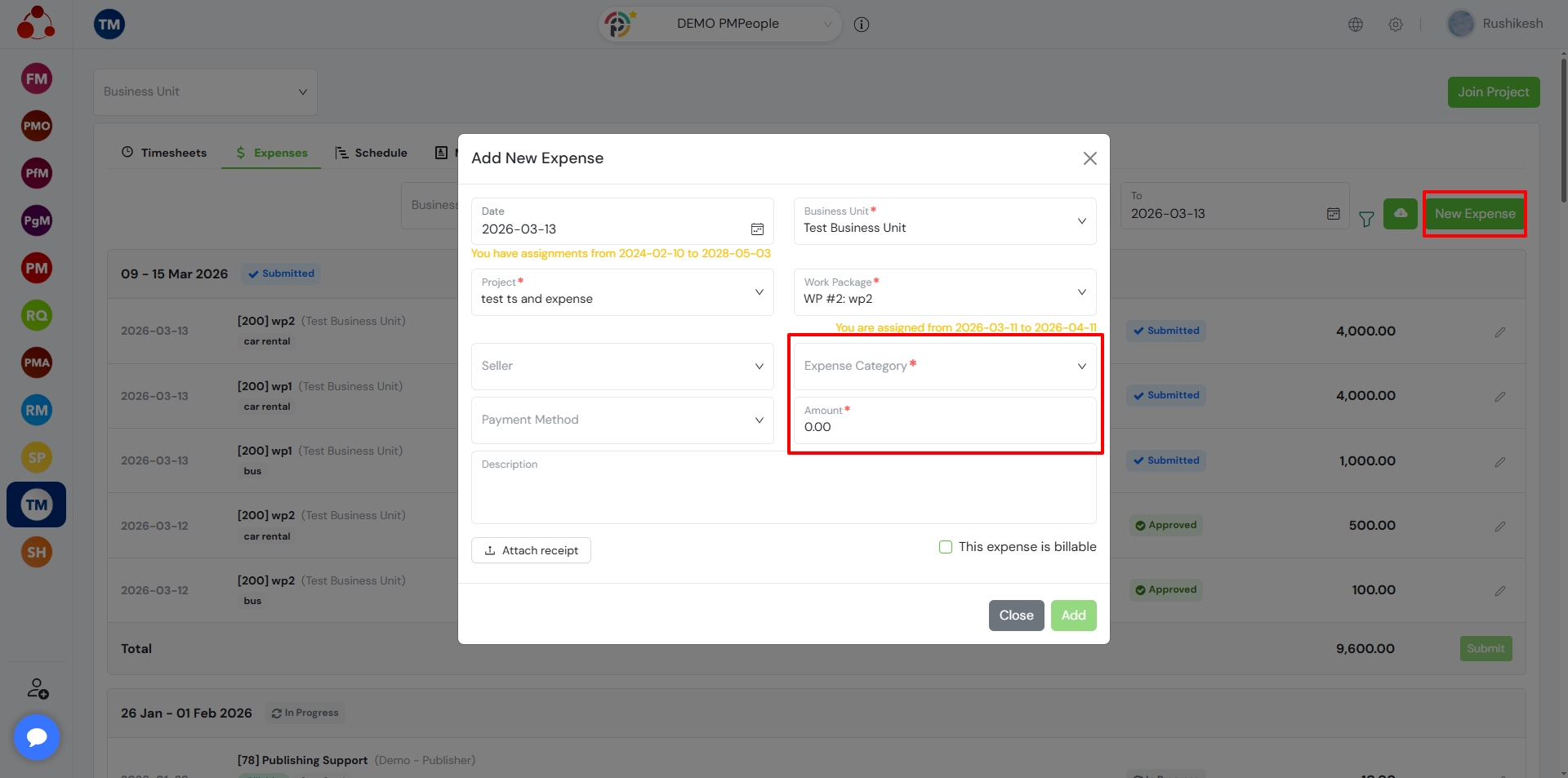 Team Members (TM) can report expenses at tab EXPENSES. Click button [New Expense], select one of the possible assignments, and enter at least the amount and the cost category (meal, taxi, mileage, etc.):
