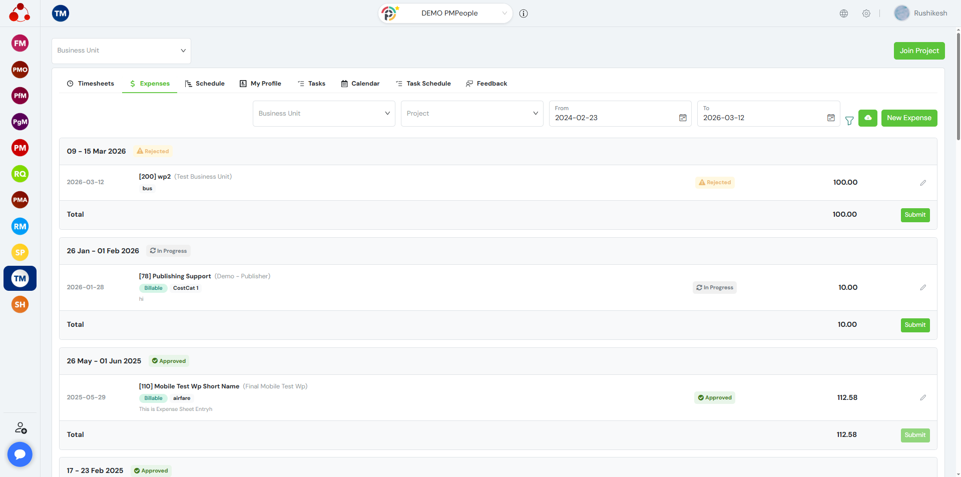 Click the “menu” icon to submit the expenses for the day [Submit Day] or for the week [Submit Week]. Users can only edit “in progress” or “rejected” expenses.